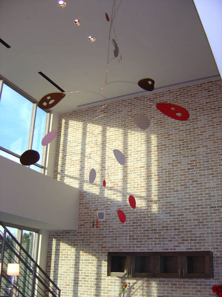 The Megamo is one of my first XXL designs made for a larger open space. It now comes in two more sizes, still all are very large. The Megamo has been made for many businesses; hospitals, furniture stores, city halls, corporate headquarters, eateries, wineries, law offices, galleries and uni-versities. All needing a large Calder-kinetic style art mobile to hang in their open area. This large mobile is actually very light in weight, comes all assembled, and ready to hang.